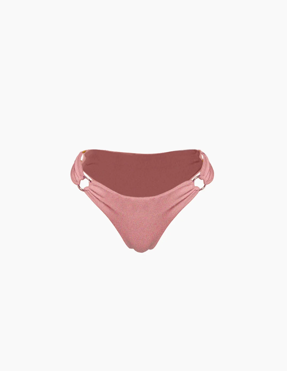 Presented in Flamingo Pink, this soft & durable fabric feels great against your skin. Show a little extra in this classic high-cut leg bikini with eye catching gold rings. Moderate coverage design.