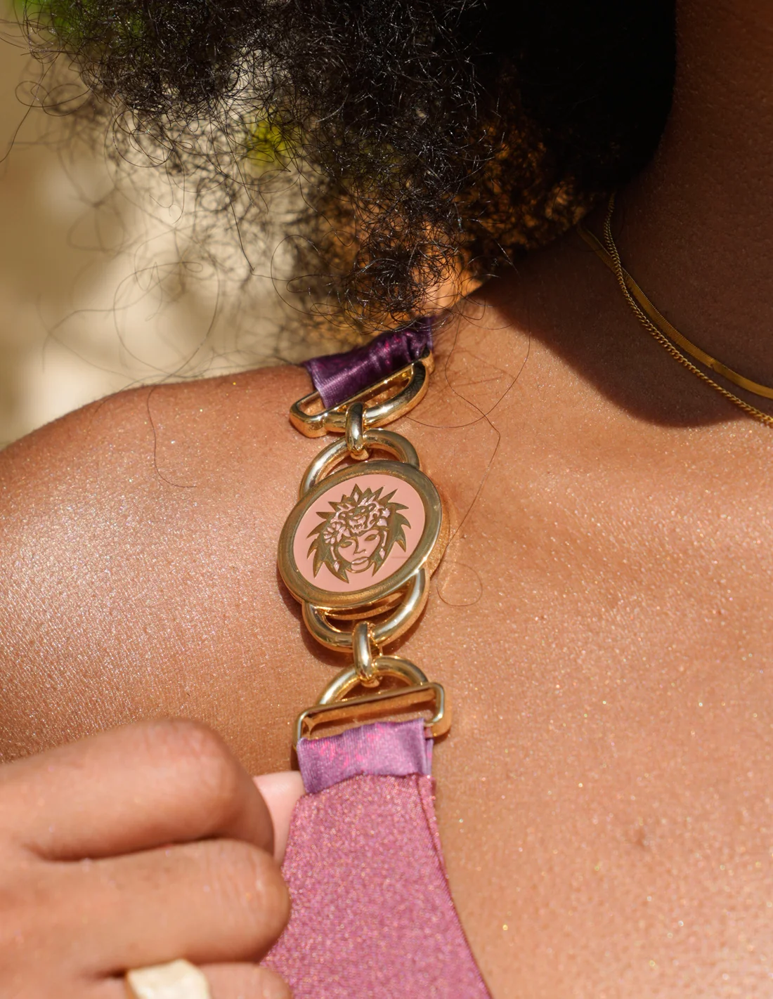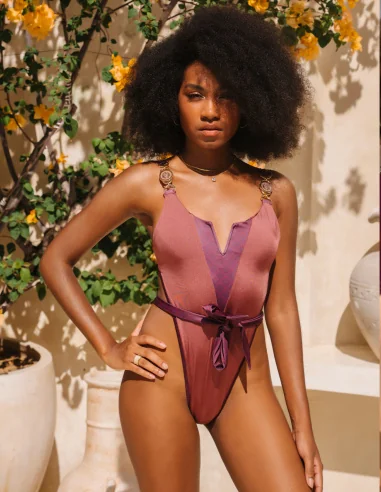 This chic and eye-catching one-piece swimsuit is a perfect blend of luxury and style, crafted from ultra-soft, breathable fabric that ensures all-day comfort. The swimsuit features our signature Caeirie monogram print, adding a timeless, iconic touch. A flattering V-cut design and adjustable straps provide a feminine silhouette, while the bold, statement Caeirie clasp elevates the overall design. The wraparound waist ties offer a customizable fit, giving you the freedom to adjust the look to your liking. Whether you're lounging in the sun or taking a dip, this piece promises to be a standout addition to your swimwear collection.